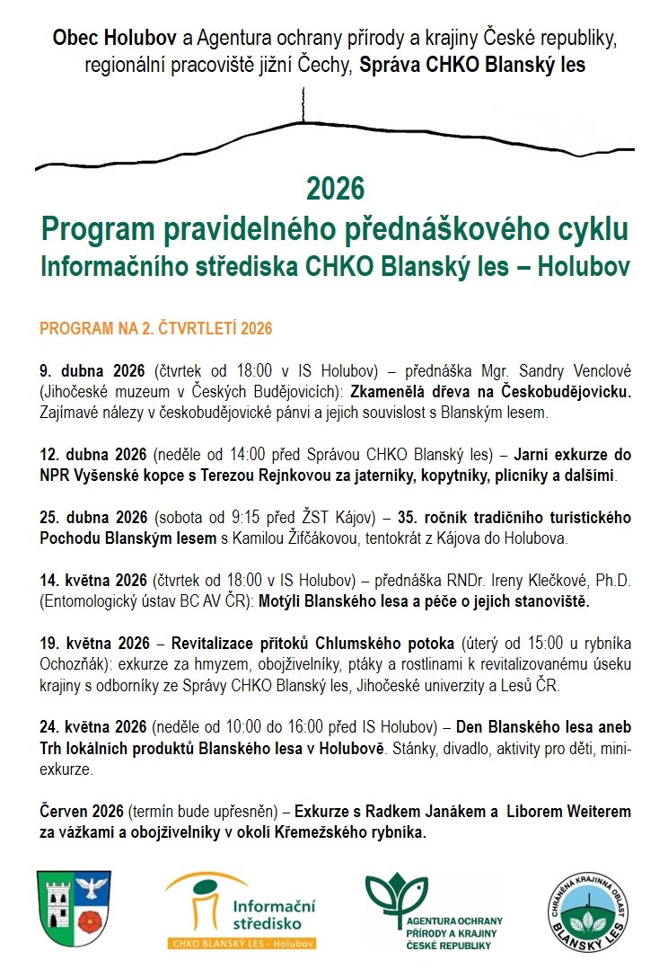 Program přednášek a exkurzí pořádaných ve spolupráci s Informačním střediskem CHKO Blanský les - Holubov na jaro 2026 je hotový. Těšíme se na viděnou na některé (a nejlépe na všech) z našich akcí.