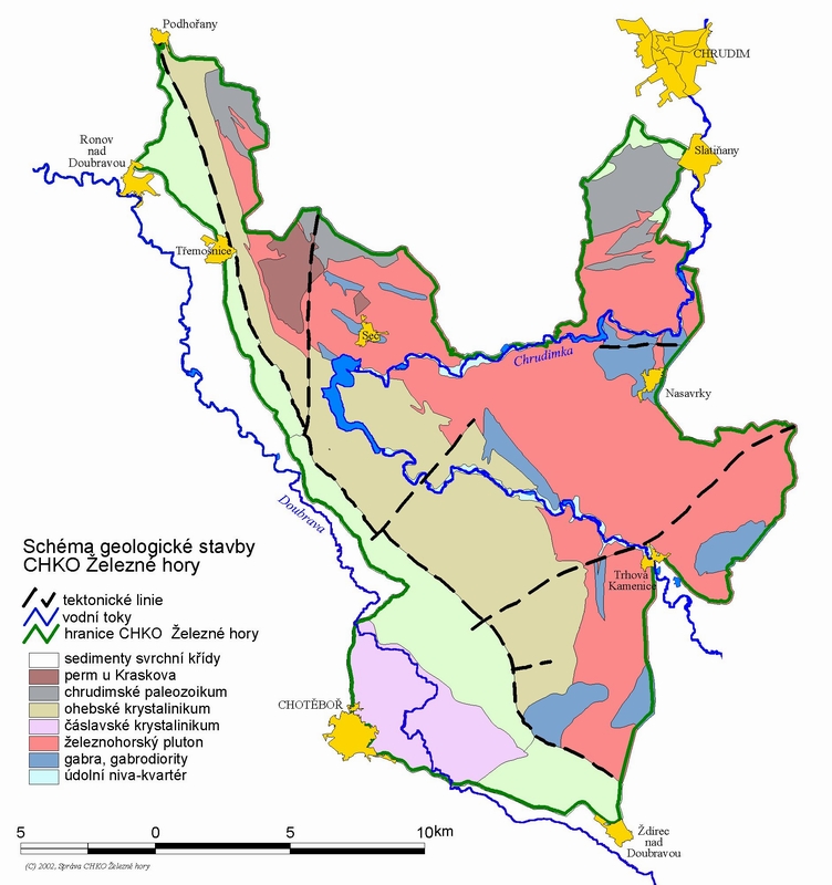 Nejstarším geologickým útvarem je starohorní Podhořanské krystalinikum v severozápadní části chráněné krajinné oblasti. Největší rozsah tu zabírají vyvřeliny Železnohorského plutonu. Před 290 až 360 miliony lety magma vniklo do prostoru střední a jižní části Železných hor a dalo základ pro vytvoření pestré škály hornin – od světlých žul k tmavým gabrům. Prvohorní permské usazeniny lze najít v okolí Kraskova. Podmiňují charakteristickou načervenalou barvu tamních půd. Podél jihozápadního okraje území se táhne úzký pás s usazeninami druhohorního moře, tzv. Dlouhá mez. Vyskytují se zde pískovce, slepence a slínovce, které ve svých vrstvách obsahují přirozené, přírodně filtrované akumulace podzemních vod.